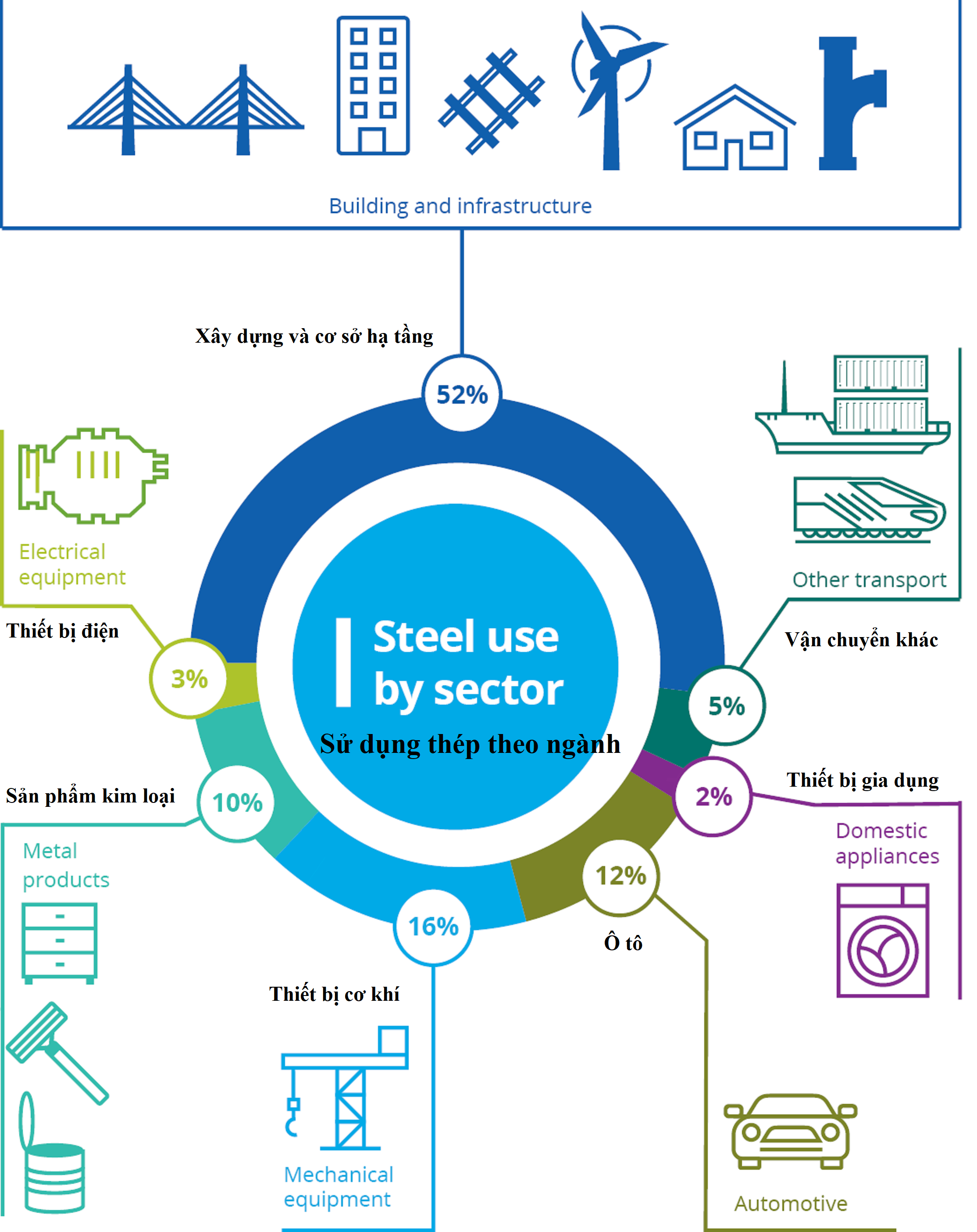 Thép có mặt ở khắp mọi nơi trong cuộc sống của chúng ta. Dưới đây là tổng quan về tỷ lệ thép được sử dụng trong từng ngành công nghiệp.